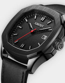 With luxury details and styling, the Urban Sunrise is a serious head-turner. The black polished and satin-finish appearance complimented with the luminous numerals and red accents is bold and stylish and would compliment any outfit.