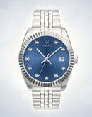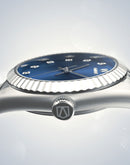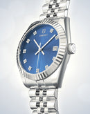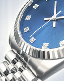 The sapphire blue sunburst dial features a date window at 3 o’clock, as well as the indexes, which are made up of polished Rhinestones set in a plated silver steel mount.