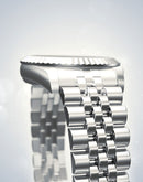 In this model, the symmetrical 34 mm case and integrated bracelet are crafted from the finest brushed and polished stainless steel.